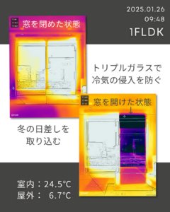 窓を開けた状態と閉めた状態での温度差をご覧ください。トリプルガラスで冷気の侵入を強力にシャットアウト!