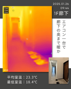結果は次の通り。エアコン1台でもお家全体が暖かく、さらにその暖かさは均一です。