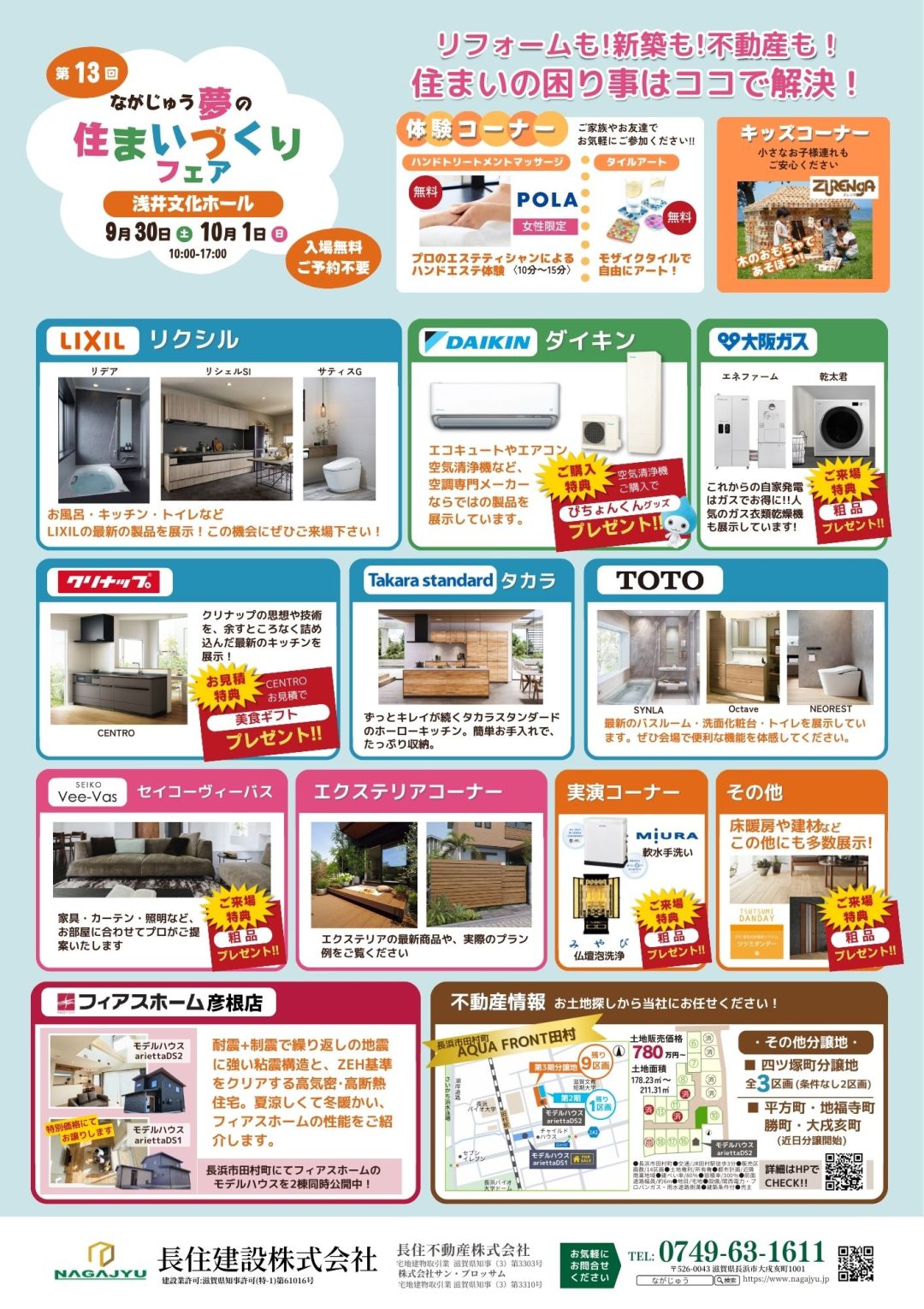 | その他 | リフォームも!新築も!不動産も! 住まいのお困り事はココで解決! ながじゅう夢の住まいづくりフェアを開催いたします キッチン、お風呂、洗面化粧台、トイレなど 各メーカーの最新の設備をずらりと取り揃えてお待ちしております お子さまには木のおもちゃ「ズレンガ」でめいっぱい遊んでいただけます! 奥様にはPOLAのエステティシャンによるハンドマッサージ体験を さらに9月30日(土)は、フルーツサンドで有名な二葉屋さんの移動販売もあります! 売切れ次第終了となりますので、ぜひお早めに!! その他にもモザイクタイルアートやお菓子のつかみ取り、ガラポン抽選会など みなさまに楽しんで頂けるイベントをご用意しております 入場無料・ご予約は不要です みなさまのご来場をお待ちしております! |