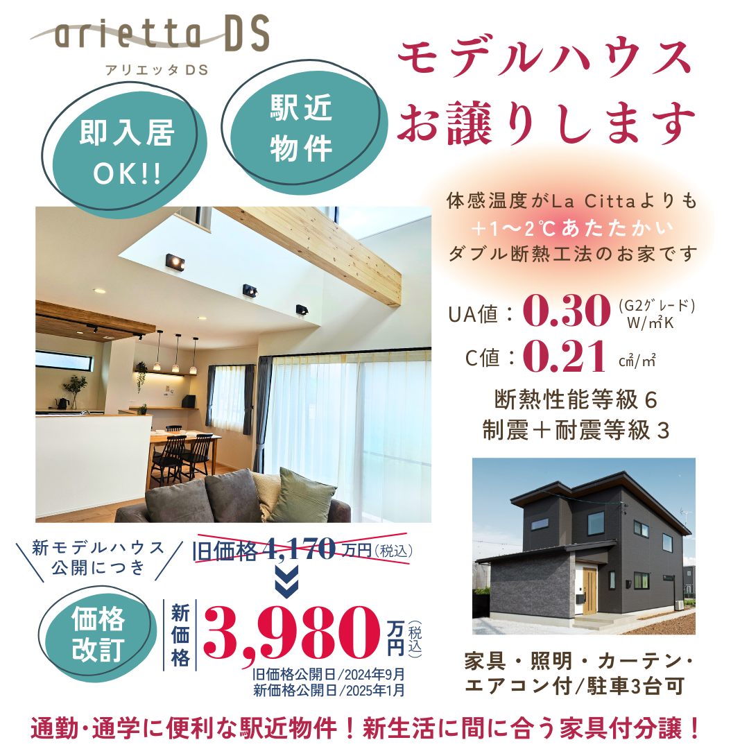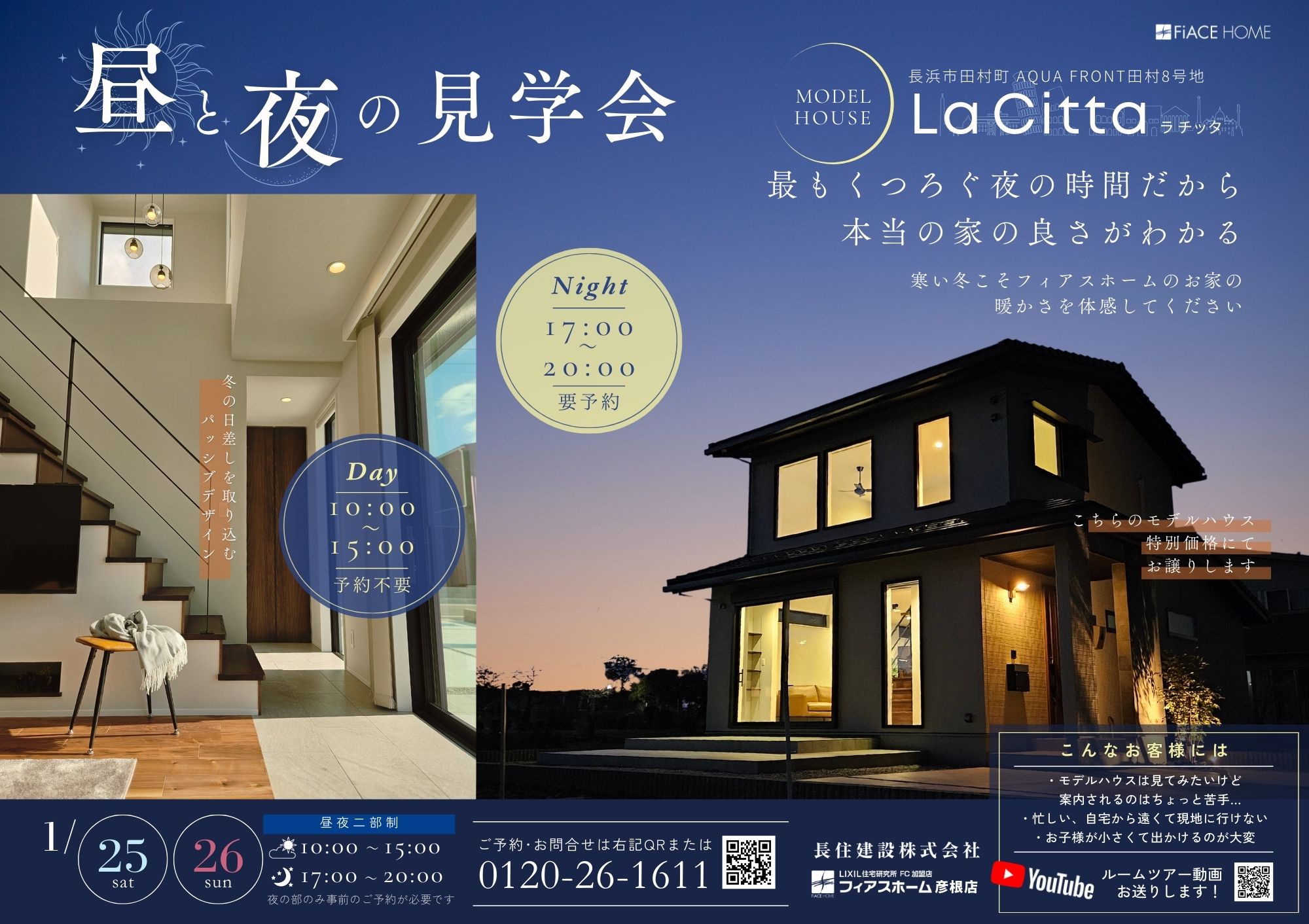 | その他 | MODEL HOUSE La Citta 昼と夜の見学会を開催します 冷え込む冬だからこそ、 フィアスホームの断熱性能を体感してみませんか? フィアスホーム彦根店の年明け第一弾のイベントは、 長浜市田村町の新モデルハウス「La Citta」で体験見学会を開催いたします。 オリジナル断熱材「eパネル」やトリプルガラスにより実現した 世界基準の断熱性能と高気密性能 自然の恵みを活かしたパッシブデザインで 素足で過ごしてもヒヤッとしない暖かさです 今回は昼と夜の二部制で開催! 昼の部は10時~15時で予約不要 夜の部は17時~20時で事前のご予約が必要です 一日で最もくつろぐ夜の時間 普段とは違うモデルハウスを ぜひ体感してみて下さい -------------- 【モデルハウス昼と夜の見学会】 ■会場:長浜市田村町モデルハウス「La Citta」 ■日程:1月25日㈯・26日㈰ ■時間:昼の部 10:00~15:00 夜の部 17:00~20:00 ※夜の部のみ要予約 |
