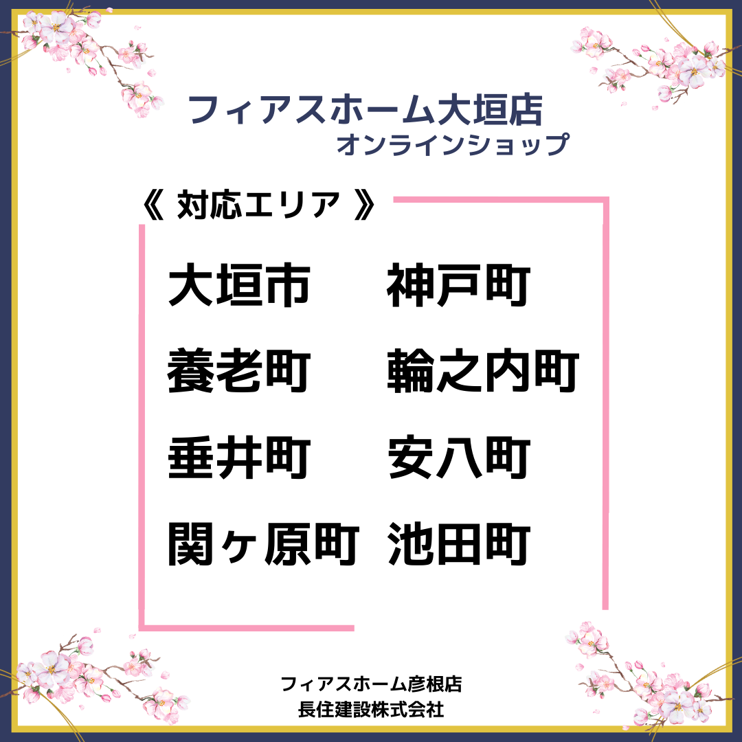 岐阜エリアへ拡大!! 投稿カテゴリー:お知らせ / ブログ / フィアスホーム 投稿公開日:2026-03-10 \\4月1日よりエリア拡大// フィアスホーム彦根店(長住建設株式会社)が フィアスホーム大垣店・岐阜南店 オンラインショップをスタートします。 岐阜エリアでも、 住まいづくりをもっと身近に。 オンラインショップなら… ・スマホやパソコンから気軽に相談 ・住まいの性能や施工事例をチェック ・資料請求も簡単 ・ご自宅から好きな時間に情報収集 忙しい方でも、 ご自宅から住まいづくりの第一歩を。 これからも地域の皆さまの 理想の住まいづくりをサポートします。 ・ おすすめ記事 地鎮祭を執り行いました ホームページをリニューアルしました \あると便利!/コンセント施工例